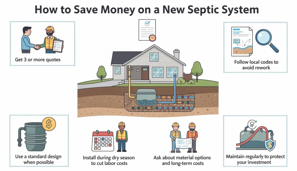 Get at least three quotes. Prices can vary significantly between contractors for the same scope of work. Schedule in the off-season. Fall and early spring are typically slower periods for septic installers. Choose the simplest system your site allows. A conventional gravity system costs half as much as a mound system. Don’t over-engineer if your soil supports a simpler design. Maintain the new system properly. The best way to protect your investment is to follow a regular pumping schedule, conserve water, and avoid flushing anything that doesn’t belong in a septic system.